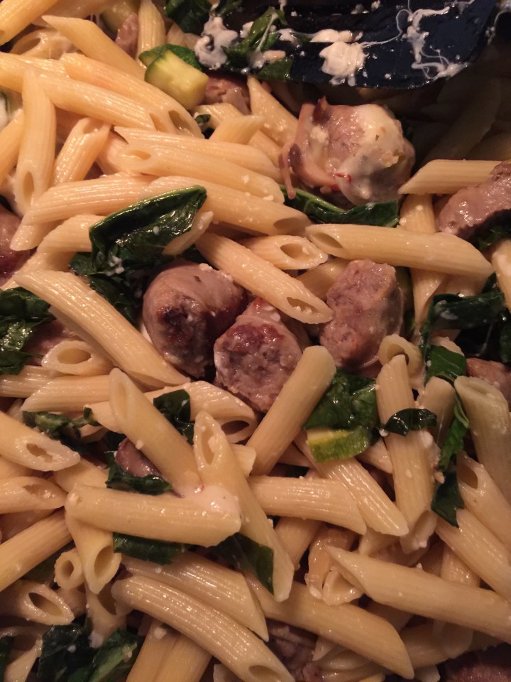 Italian sausage, onion, zucchini, mushroom, garlic and spinach with pasta, mozzarella cheese and parmigiana tossed with a little real butter and Italian dressing. I loved it and was surprised my anti-vegetarian husband enjoyed it too!