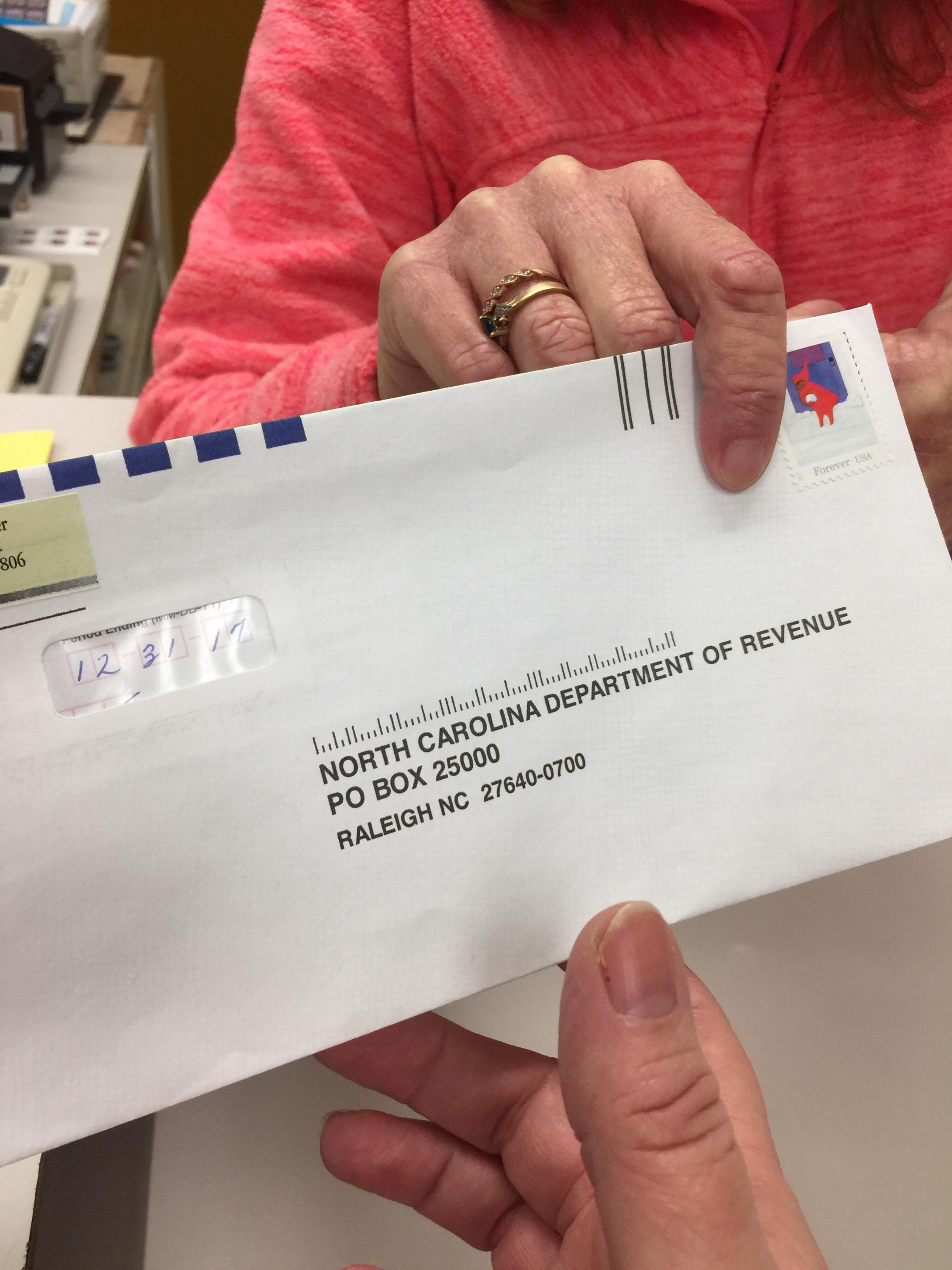 Filling out my first sales tax form was an experience I’d not soon repeat. I am not an accountant or tax preparer. I believe they purposely make these things difficult to understand just to make us look foolish when we have to call for help. Thankfully, I have a friend/cousin for that. Kathy and Catherine at H and H were a tremendous help. Catherine set everything up for me to pay my sales taxes and Kathy pulled me off the ledge by explaining what needed to go where. I made a copy so maybe I won’t have to call them again whimpering. (There’s nothing more fun than a grown woman calling you as soon as you walk in the door after a holiday, demanding and crying for you to explain the foreign language that is the North Carolina Department of Revenue.)