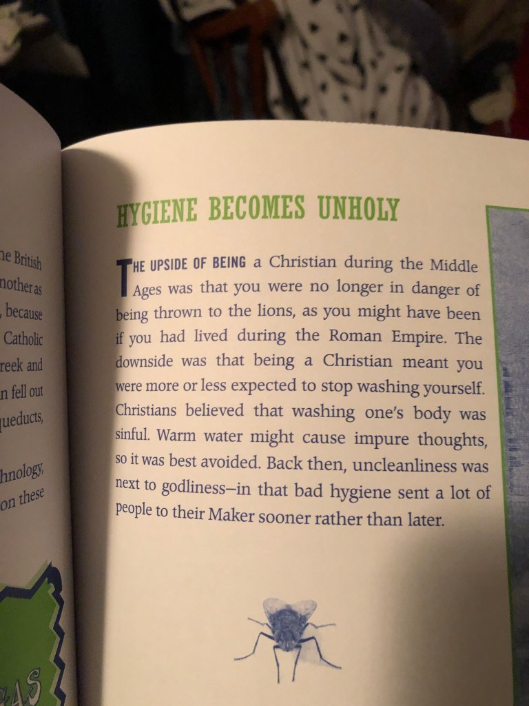 Oh, and youβve heard of the Inquisition? Did you know that if you were too clean, you could be killed as a heretic, Jew or Muslim? Yeah, Christians didnβt bathe but once a year or so. Jewish and Muslim faith believed in cleanliness, so where did the old adage βcleanliness is next to godlinessβ come from? It must not have been the Christians.