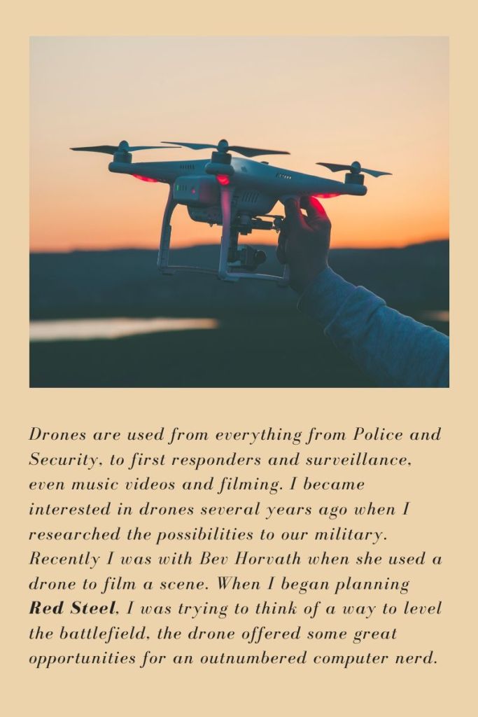 When I started planning Red Steel the idea of using drones didn’t just come to me automatically. While I’ve researched the use of drones for the military, how they are being used to deliver medicines and packages, I really hadn’t thought how I could use a drone in my story. Several months ago, my friend, Bev Horvath of South Creek Media needed extras for a video she was filming. I called people I knew and asked if they’d help. Several of us gathered together and she started filming. Later in the evening, she pulled out her drone and filmed us from the air. Seeing how smooth and clear this could be done gave me my first idea for using the drone as surveillance in my story.