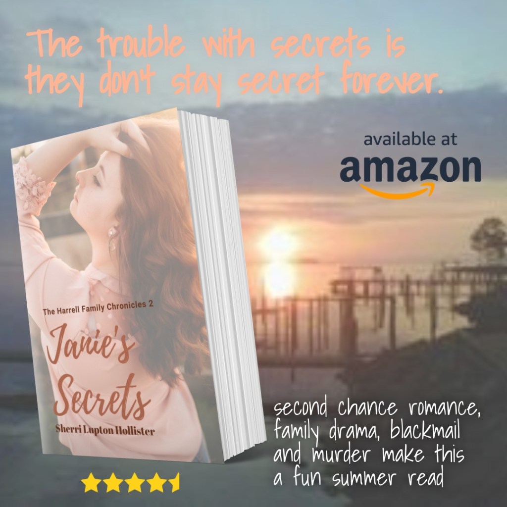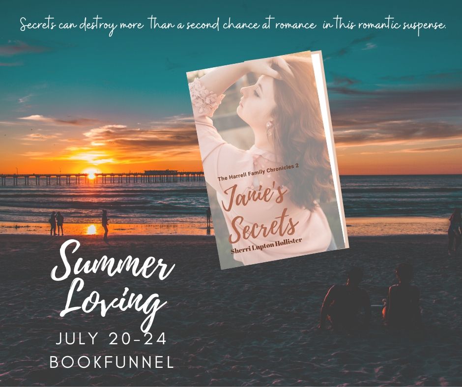 My most recent book, Janie’s Secrets is the one featured in this week’s promo Summer Loving. It’s a second chance romance, family drama, suspense thriller set on the outskirts of Leeward. More than their second chance at romance is threatened when family secrets come to light. Will Janie and Mike survive a blackmailer’s vengeance?