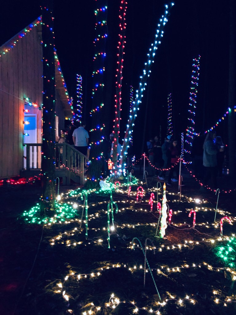 The lights twinkled on when the entered the arch over the tiny bridge separating the street from the inn’s property. As they strolled through the wonderland of decorations Brittany marveled at the addition Jack and his students implemented from the “Remembering our Military” display with each branch represented and “I’ll be home for Christmas” playing in the background to the flashing lights on Santa’s sleigh as it landed on a gingerbread house to “Up on the roof top.”