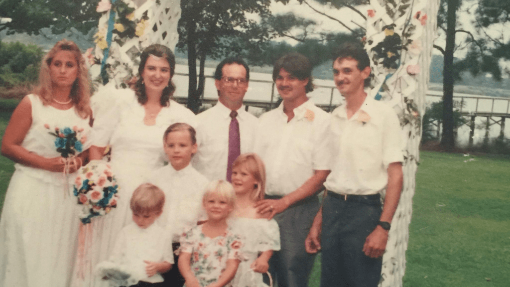 We both wore white sundresses and my two flower girls had flowered dresses on white background. The guys wore black pants and white shirts, except my groom, he wore gray. The ceremony was near perfection. It was pretty close to my dream wedding. We were married outside at my aunt’s home on the river. My father-in-law built us a trellis and we decorated it with flowers. We had a pig picking for our reception. Our brother-in-law cooked the pig. Altogether we probably didn’t spend a thousand dollars including the cake and the food. I’d say it was closer to five hundred.