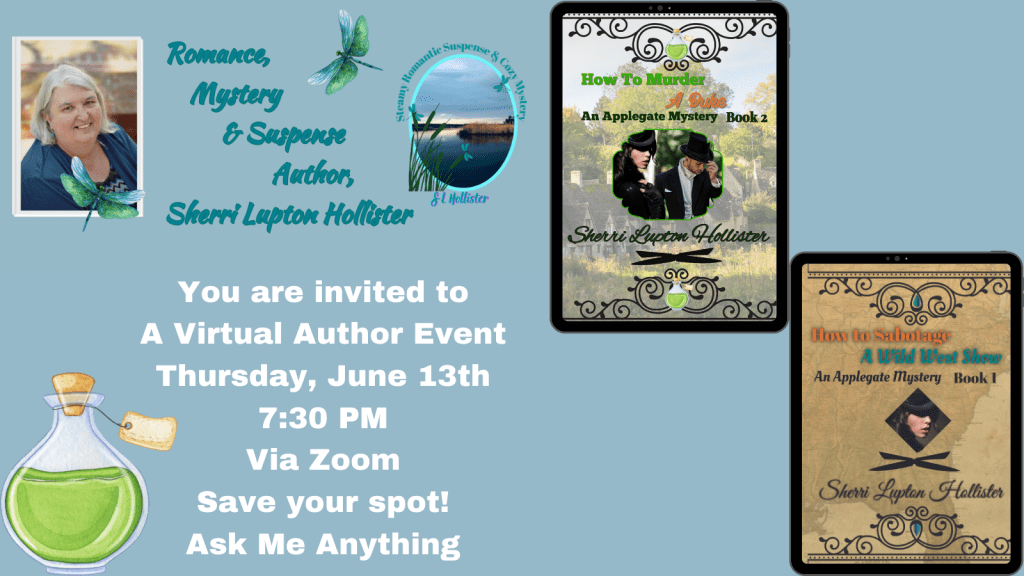 Join me Thursday, June 13th at 7:30 pm for a virtual book launch via Zoom. To secure your spot, email me at applegatemysteries@gmail.com. This is a free event. Games, prizes and backstory, as well as a brief reading from How to Murder a Duke. Come and get the story behind the story. There will be time for questions and answers.