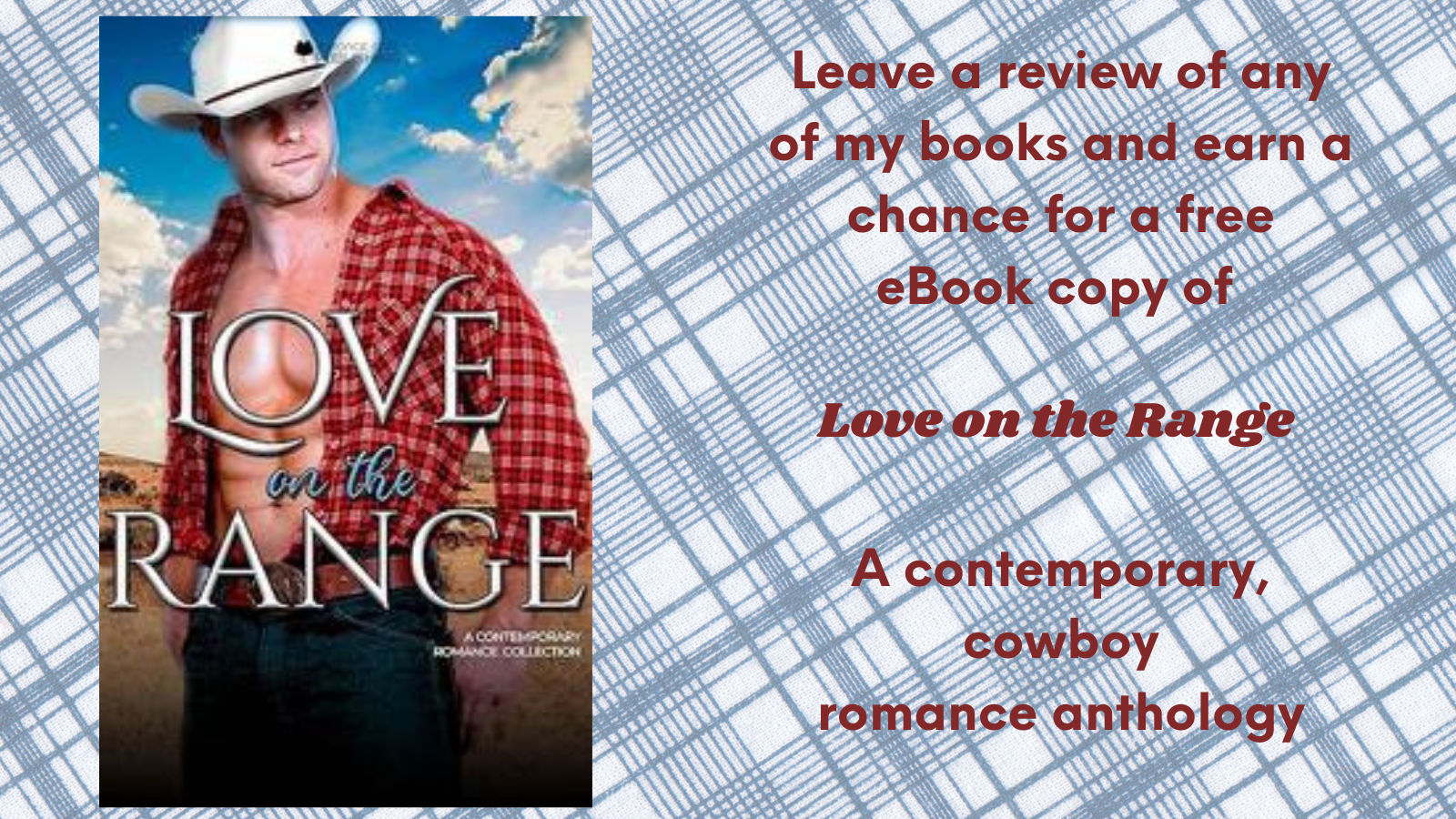 Follow Me, Leave a Review of one of my books, Repost/Share and Comment on my posts. Help me celebrate and earn a chance to win a copy of The New Romance Anthology, Love on the Range, a contemporary, cowboy romance anthology.