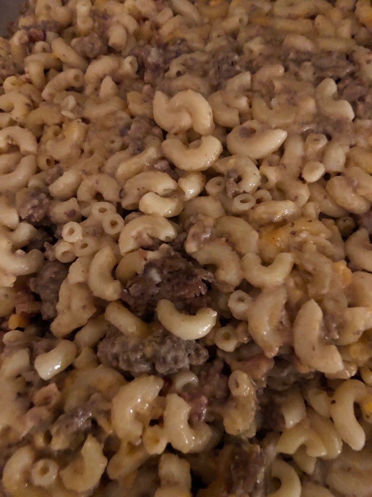 Two pounds of Hamburger seasoned and browned. I season with Tonyβs Cajun Seasoning and McCormickβs Steakhouse seasoning with extra garlic and onion powder. I used 75/25 for less grease. Drain if very greasy. I used the hamburger fat instead of adding butter to make my cheese sauce.
