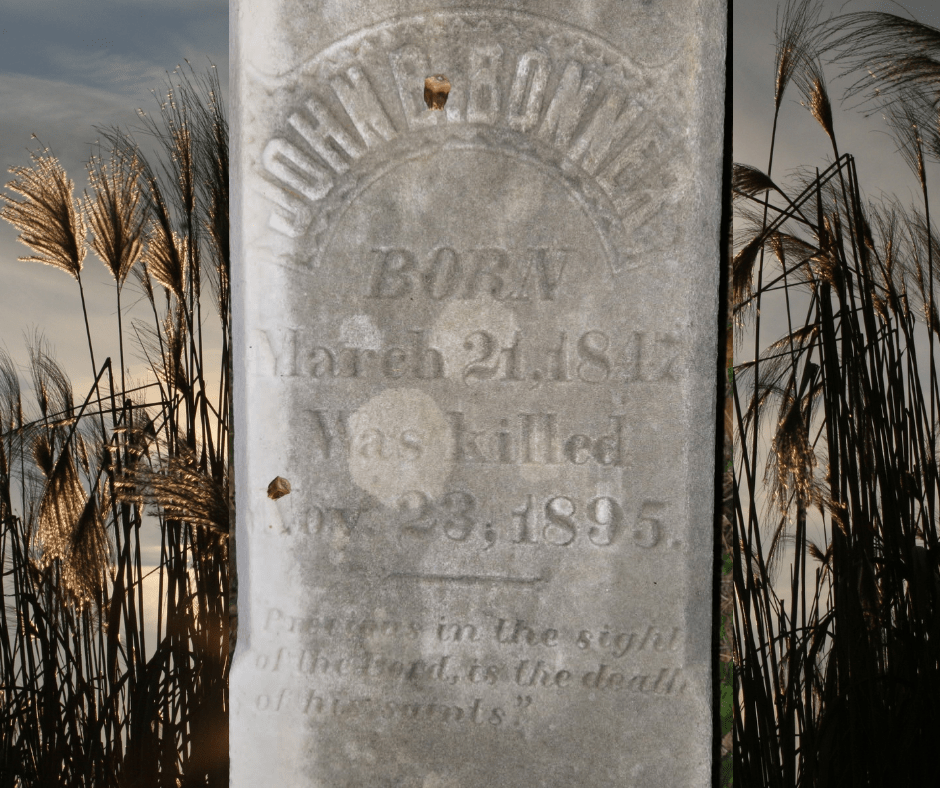 John Bonner’s tombstone is located behind the United Methodist Church in Aurora. On it is the traditional born, March 21, 1812, but then it says “was killed” November 23rd, 1895.