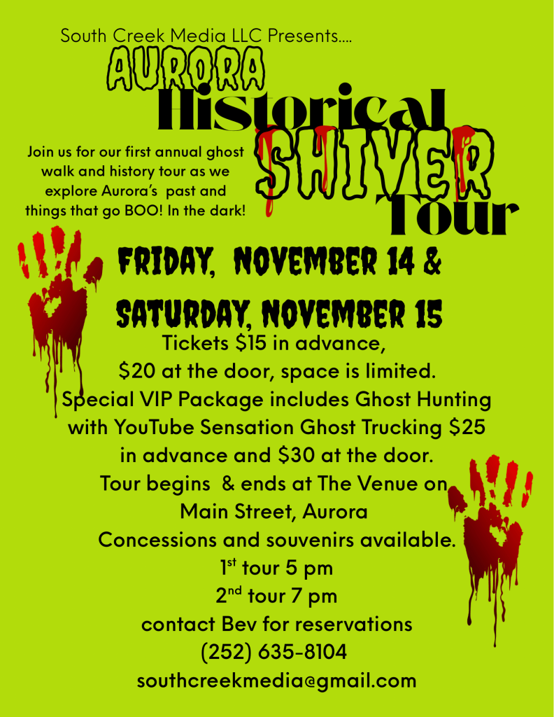 Check in for the two walking tours/ghost hunting experience in Aurora is fifteen minutes prior to each tour (5pm and 7pm) at The Venue, 468 Main Street. Rides will be provided for those unable to walk the one-mile-long tour. Concessions and souvenirs will be available for purchase before and after each tour. Presale ticket cost for the walking tour only are $15, there is a VIP ticket option that includes the ghost hunting experience for $25.00. Tickets bought at the door will have an additional $5.00 fee. Contact Bev Horvath (252-635-8104) at the Blue Crab Boutique on Main Street Aurora for more information and to reserve your tour as spots are limited! We look forward to your presence.